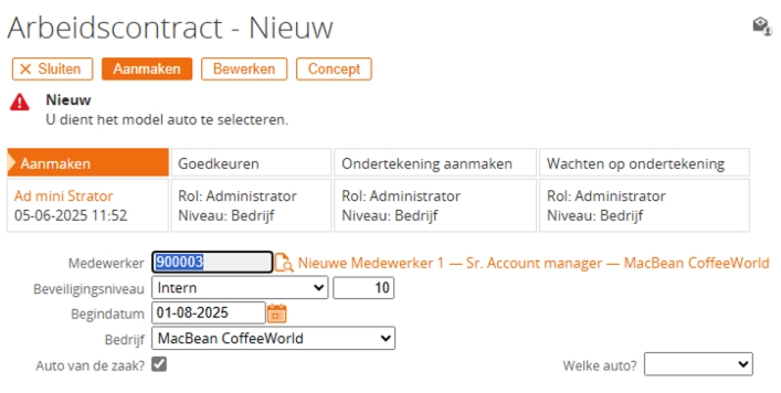 Validatie: Kies het model auto indien Auto van de zaak is aangevinkt